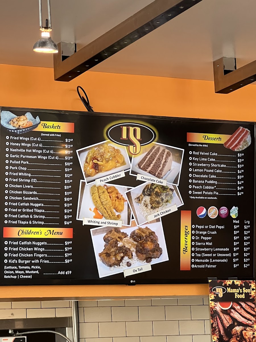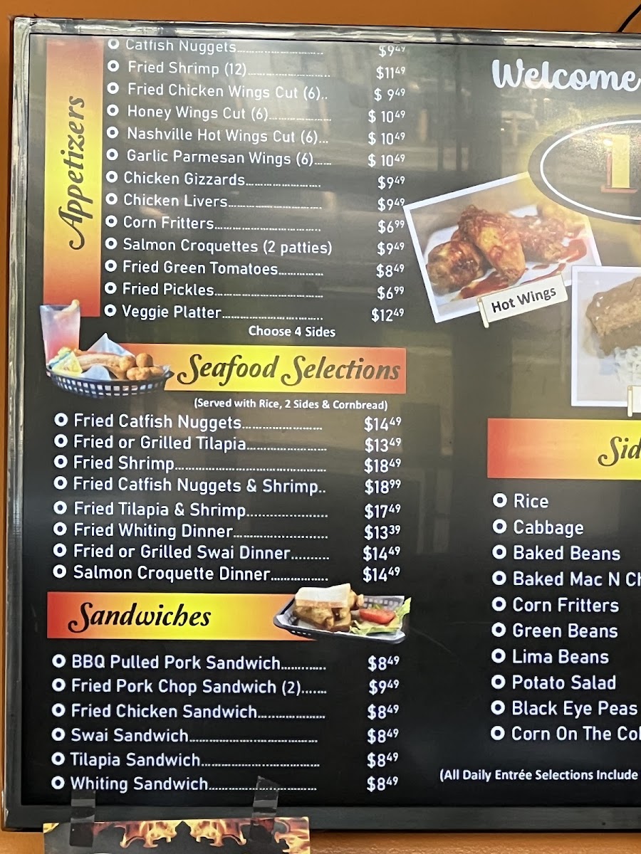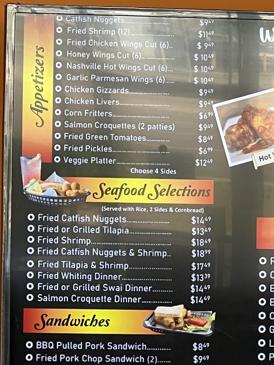 Fried catfish and shrimp basket: Deep-fried catfish fillets and shrimp, typically served with fries.